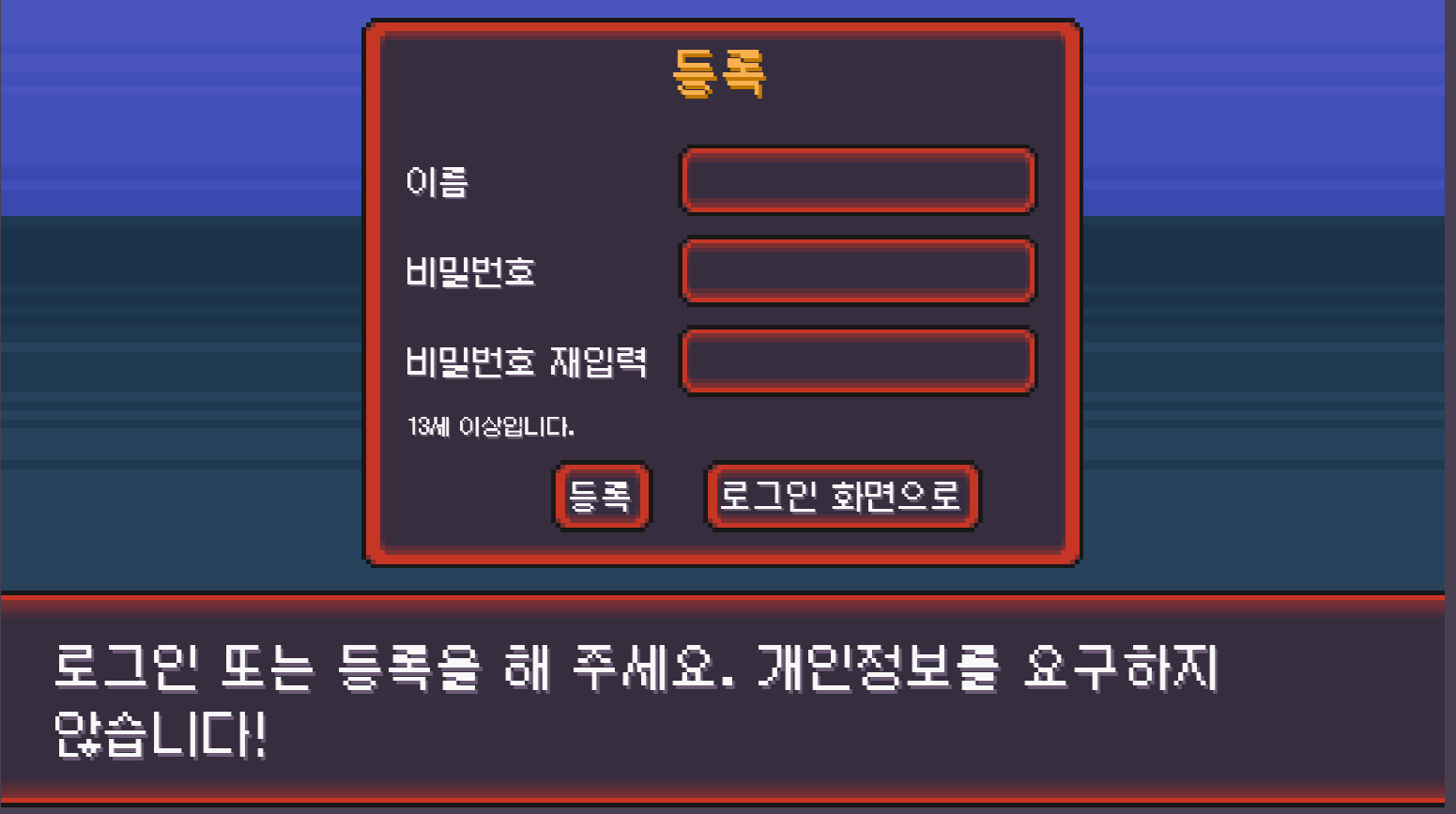 📌간단하게 이름과 비밀번호를 2번 입력 하는 것으로 게임을 실행 할 수 있습니다.